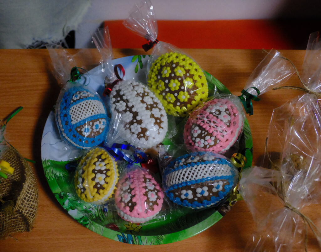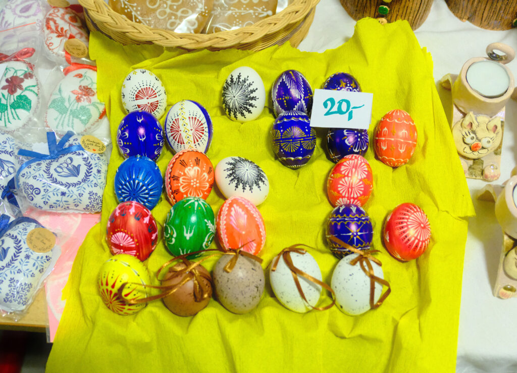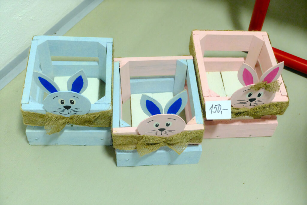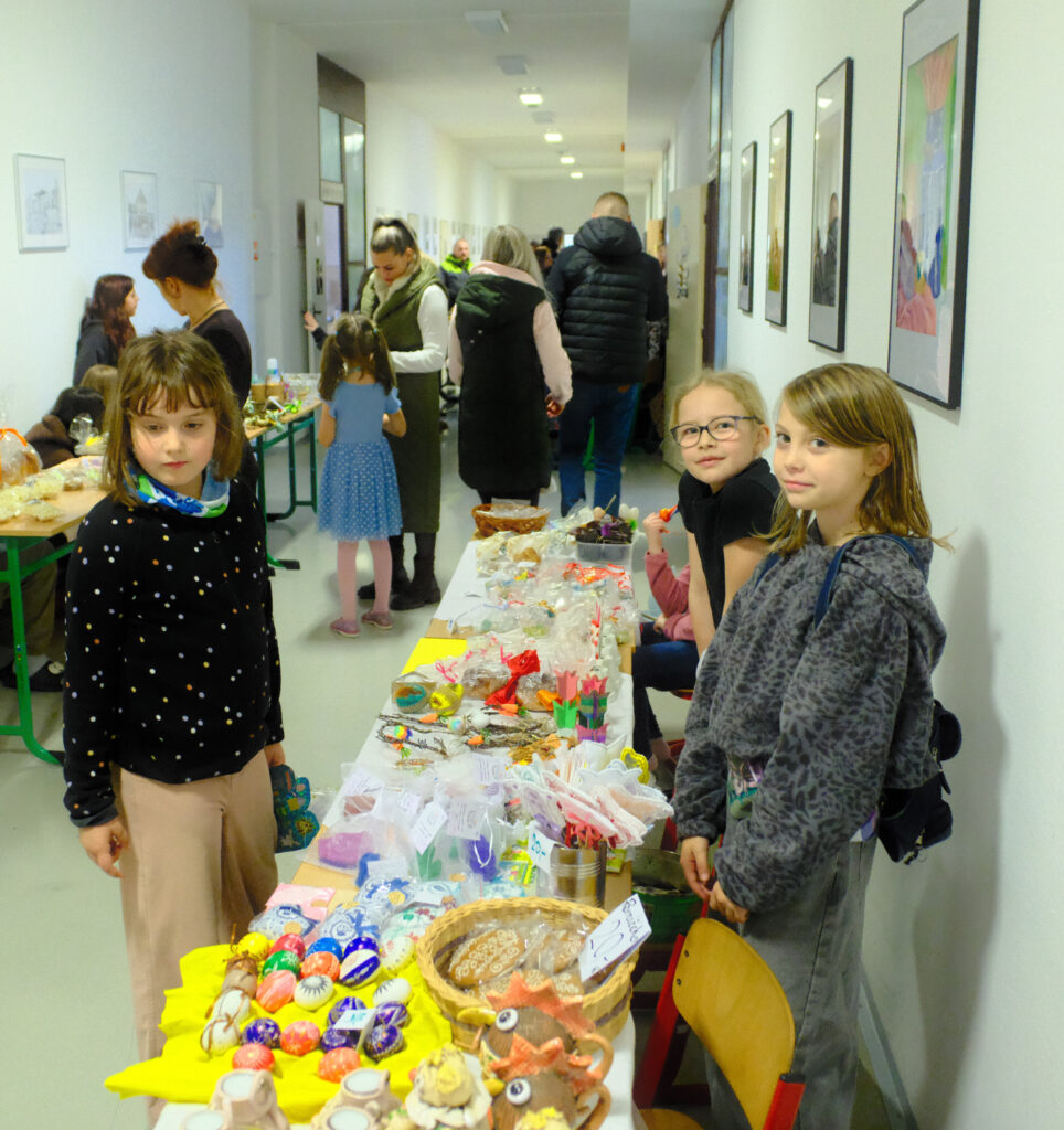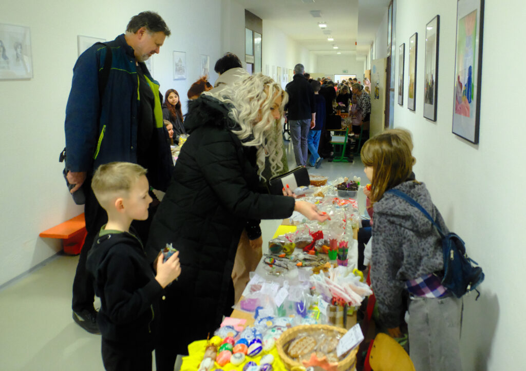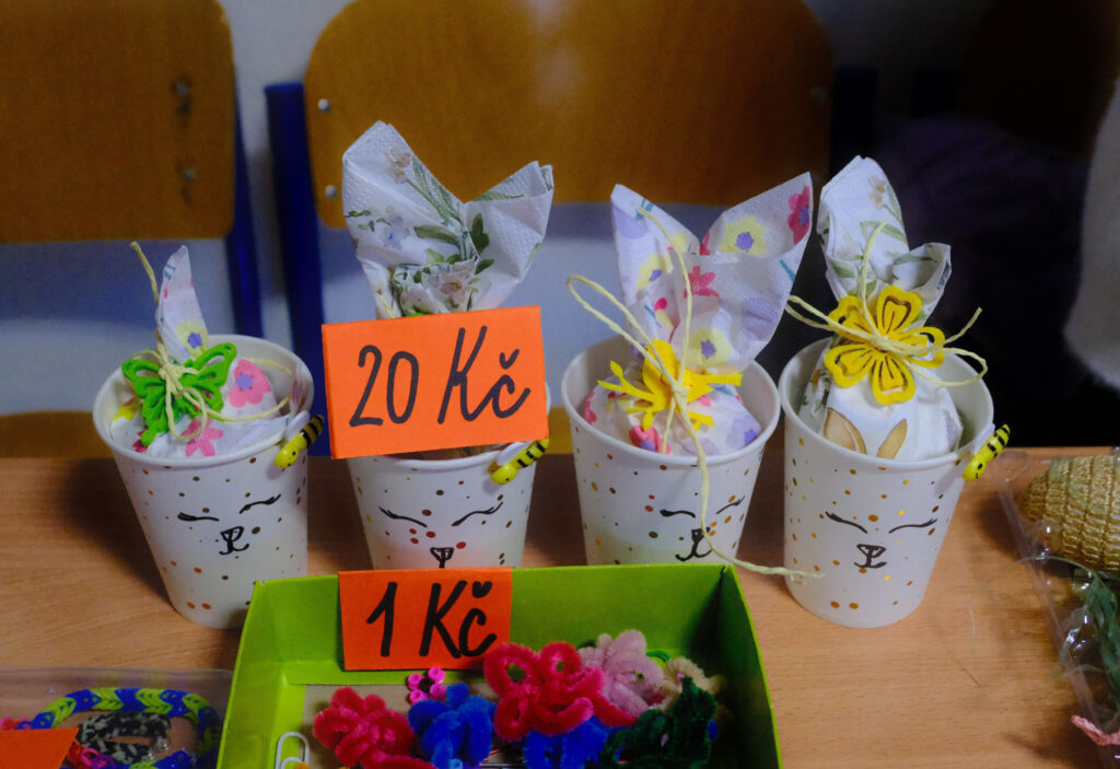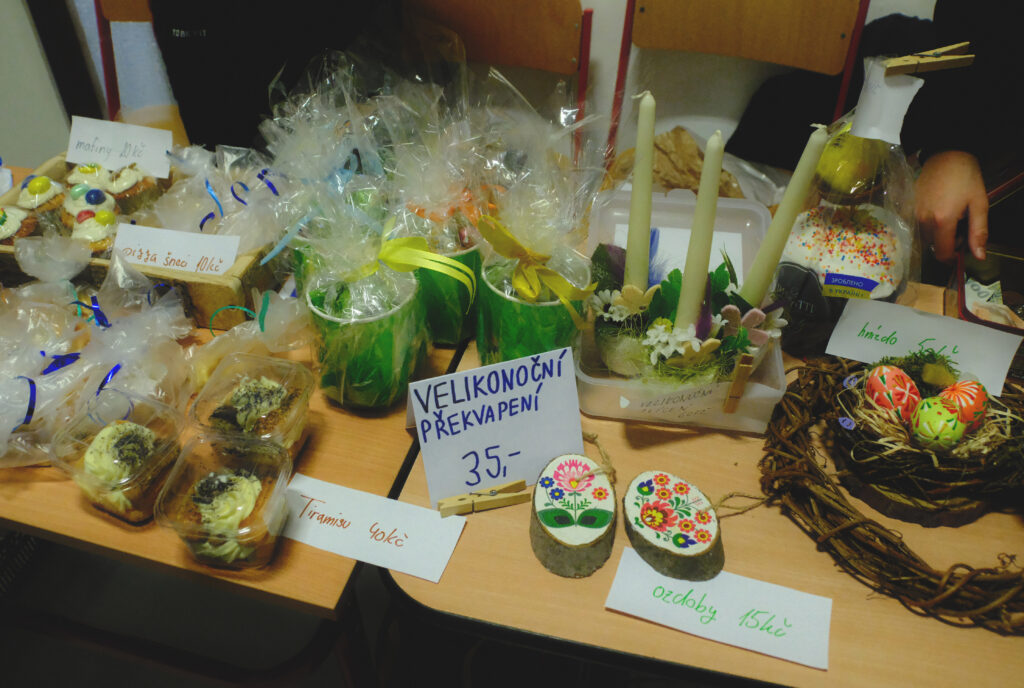 Všechny třídy si pro návštěvníky připravily vlastní prodejní stánky. Žáci v nich nabízeli výsledky své práce: velikonoční ozdoby (klasické kraslice, jarní dekorace, drobné rukodělné výrobky) a domácí dobroty (bábovky, zajíčky, perníčky i slané pečivo).