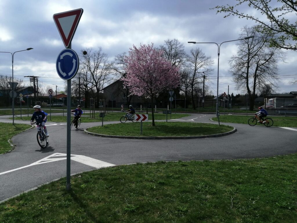2. Praktické jízdy: Na dopravním hřišti se pak teorie přenesla do pedálů. Pan policista bedlivě sledoval, zda děti dávají znamení o změně směru jízdy, zda správně zastavují na „stopce“ a jak sebevědomě se pohybují mezi ostatními účastníky provozu.