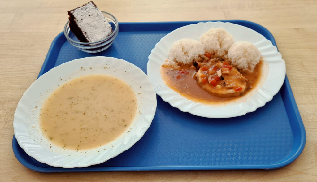 Ve čtvrtek 3. 10. 2025 nás velmi potěšilo, že měl oběd velký úspěch, byla cibulová polévka se sýrem, vepřová kotleta po venkovsku s dušenou rýží a čokoládová buchta s kousky čokolády. Dětem chutnalo a to je pro nás ta nejlepší zpětná vazba.