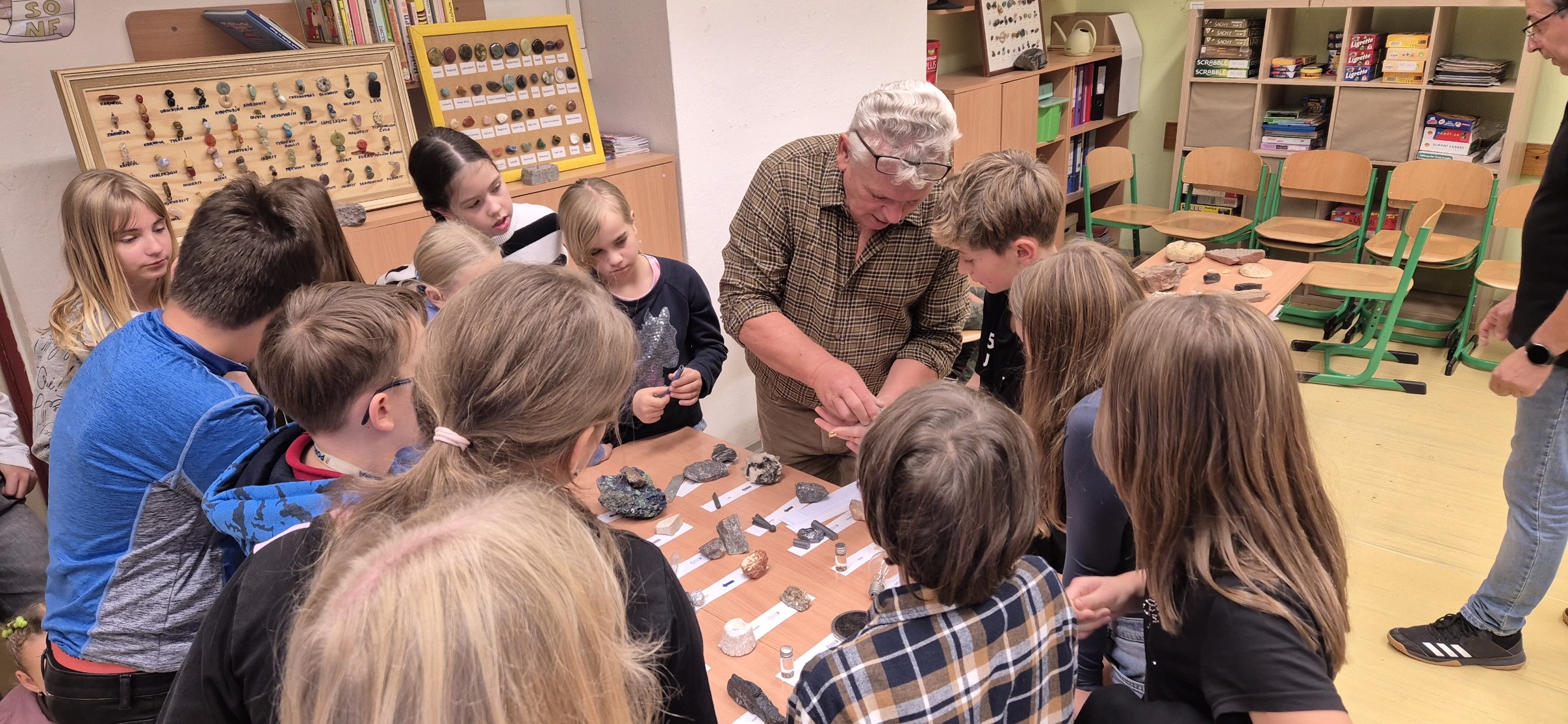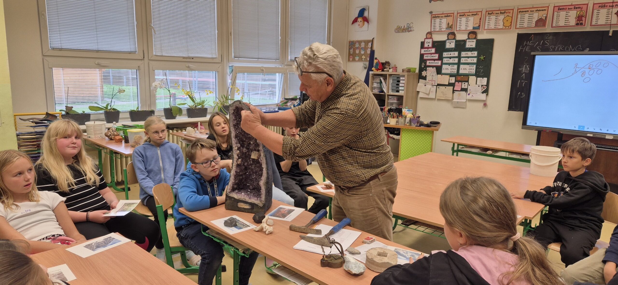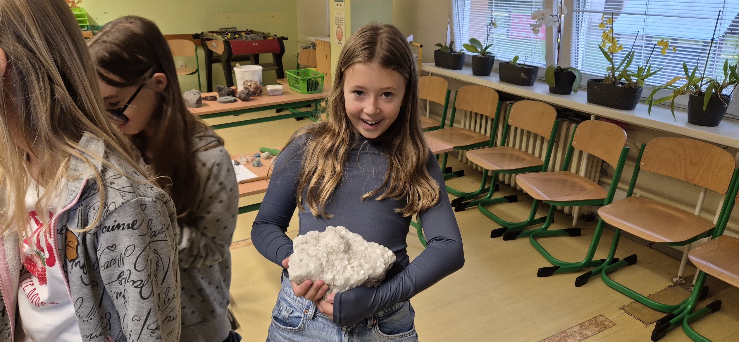 V pátek 10. října 2025 se třída 5. A naší školy zúčastnila bezmála čtyřhodinového cvičení s horninami a nerosty, které vedl pan inženýr Havelka. Do školy přivezl přibližně 200 kg vzorků, se kterými mohli žáci během dopoledne pracovat.