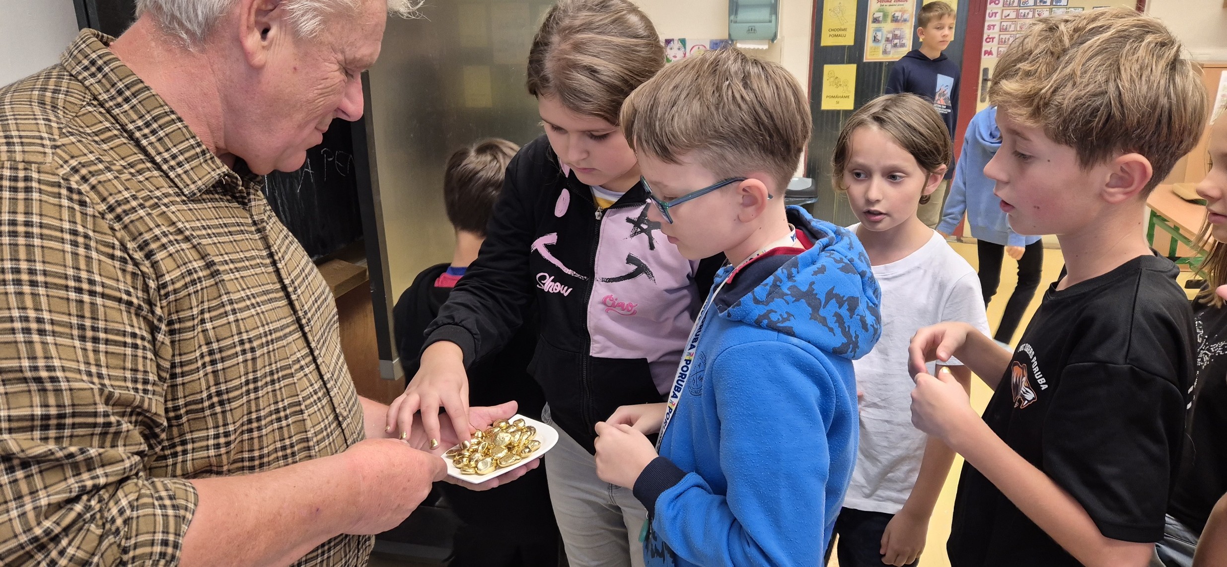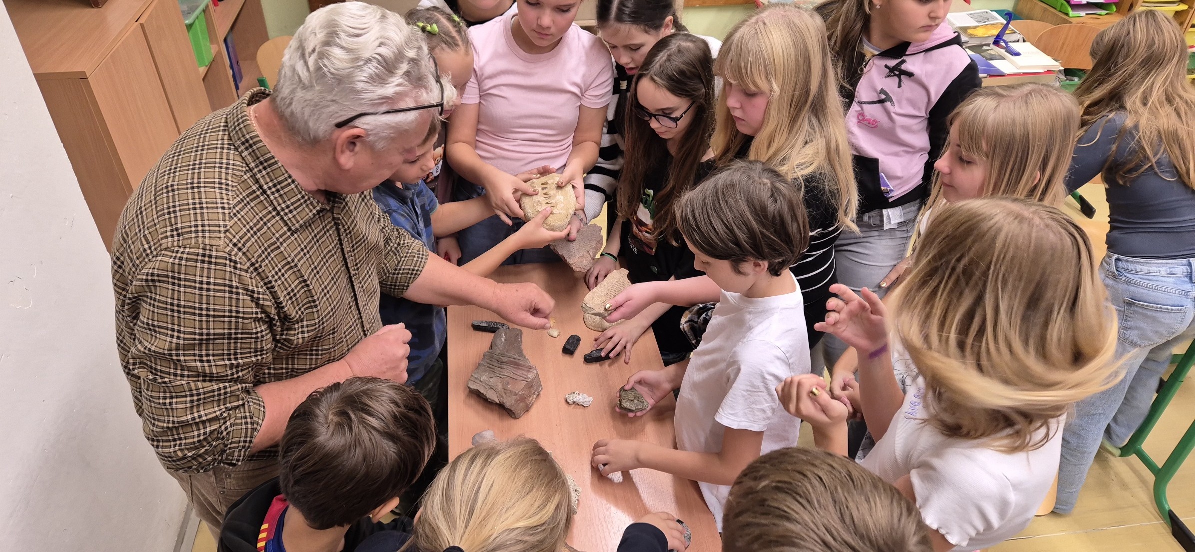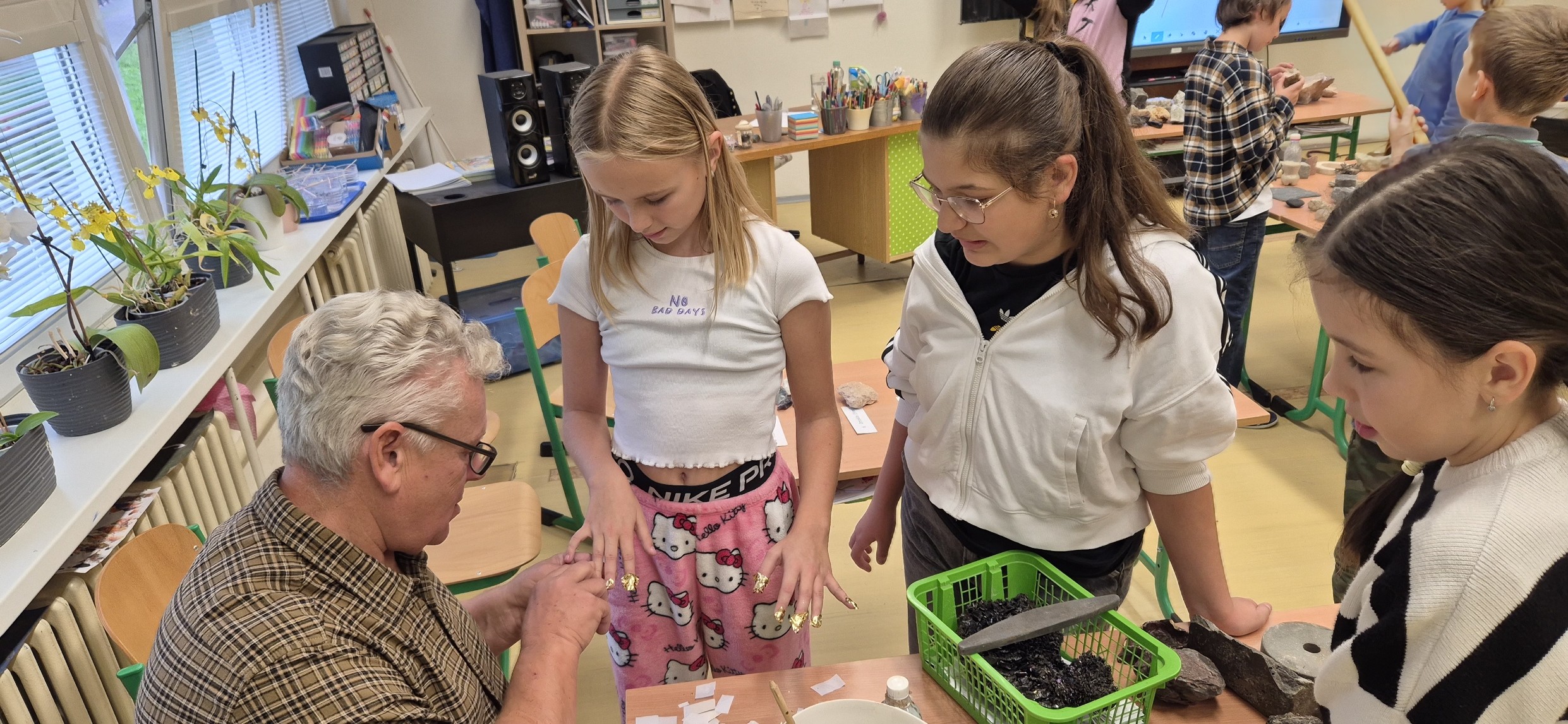 V pátek 10. října 2025 se třída 5. A naší školy zúčastnila bezmála čtyřhodinového cvičení s horninami a nerosty, které vedl pan inženýr Havelka. Do školy přivezl přibližně 200 kg vzorků, se kterými mohli žáci během dopoledne pracovat.