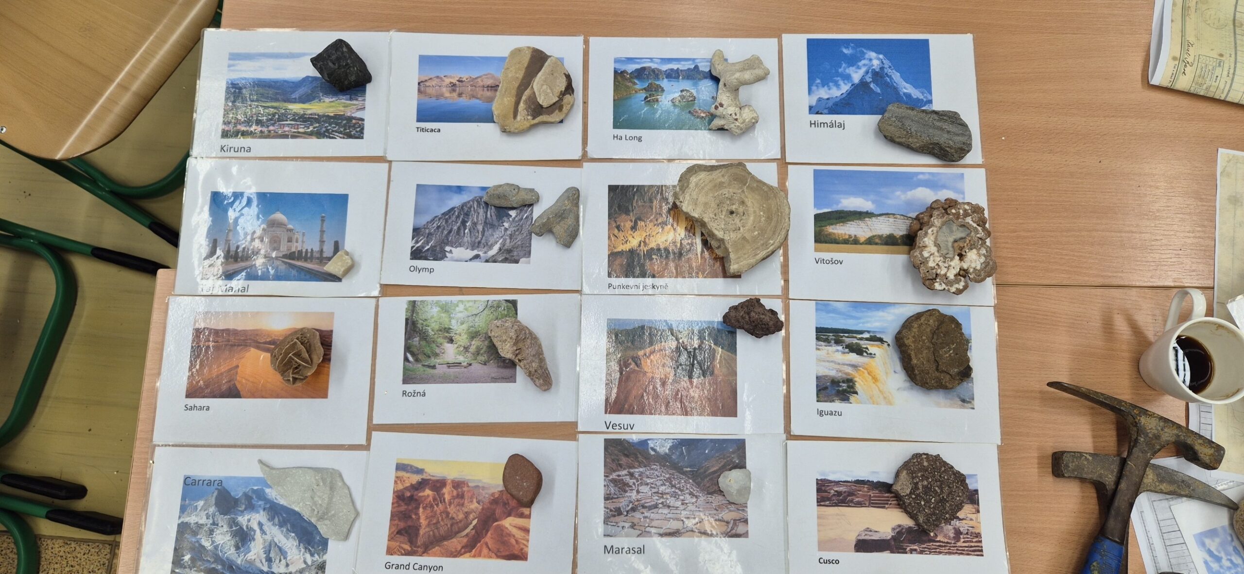 Další část cvičení spočívala v přiřazování typických hornin ke známým krajinám. Děti přiřadily krápník k Punkevní jeskyni, čedič k vodopádům Iguazu a červený pískovec k Velkému kaňonu. Mezi nejoblíbenější exponáty patřila geoda ametystu z Minas Gerais vážící 25 kg, u níž se žáci dozvěděli, jak geody vznikají, jak se v krajině hledají a nakonec dobývají ze země.