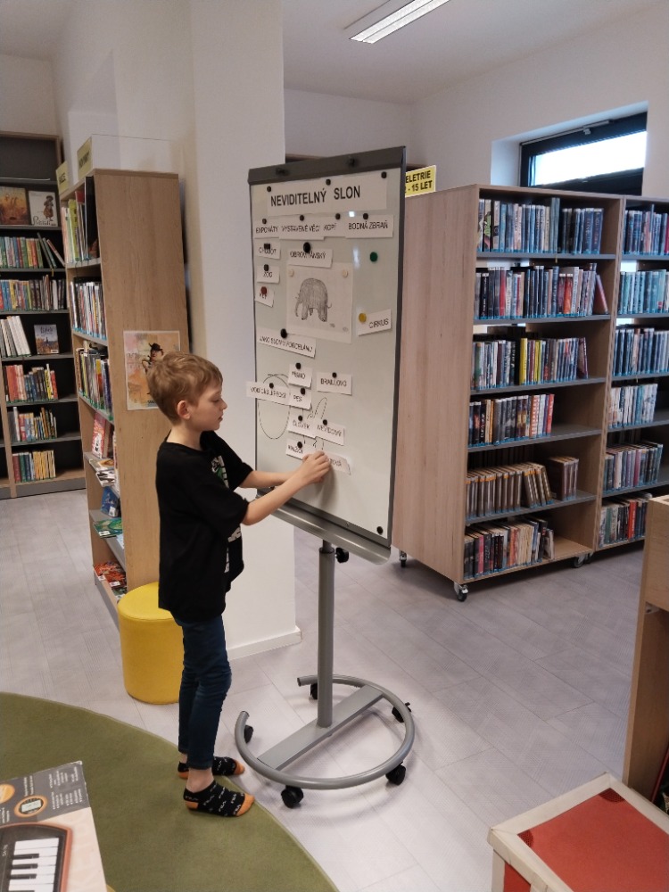 Během besedy nám paní knihovnice přečetla ukázku z kapitoly, ve které jde holčička se svým tatínkem do muzea. Protože nevidí, poznává vystavené exponáty jiným způsobem – může si je osahat rukama a představit si, jak vypadají. Díky tomu jsme si uvědomili, že lidé se zrakovým postižením poznávají svět trochu jinak než my.