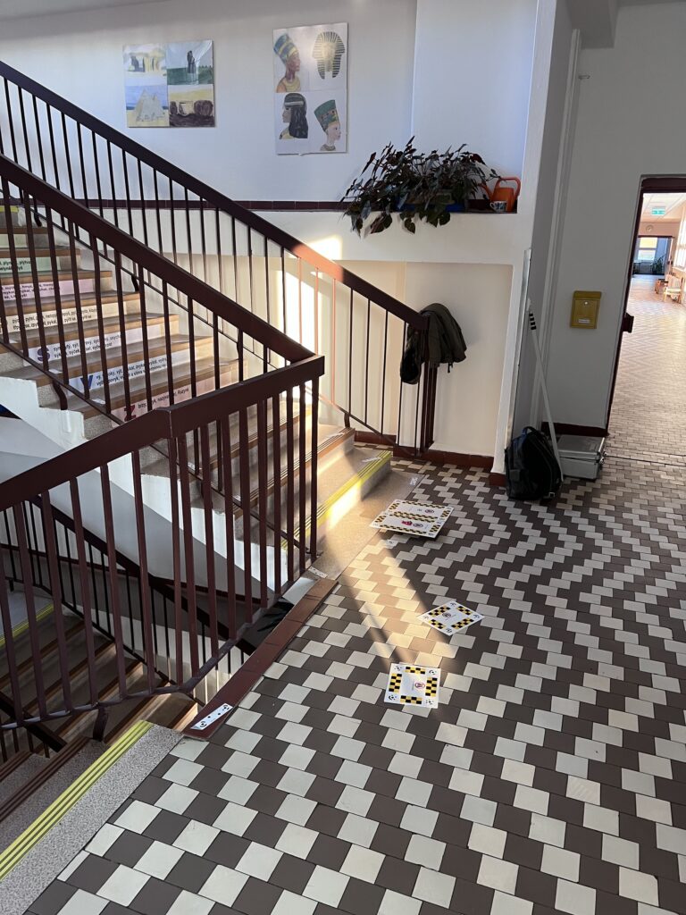Kdo dnes, v pondělí 23. 3. 2026, v ranních hodinách prošel kolem školního schodiště, mohl nabýt dojmu, že se chystá nová podlahová hra pro děti. Tyto značky na zemi ale neslouží k přeskakování, slalomu ani tajné misi školní družiny. Ve skutečnosti jde o první kroky k něčemu mnohem důležitějšímu – v rámci projektu „Revitalizace školní družiny pro ZŠ J. Valčíka“, podpořeného v rámci Operačního programu Spravedlivá transformace, se začalo s vyměřováním místa pro bezbariérovou plošinu, která v budoucnu zajistí přístup do 1. patra.