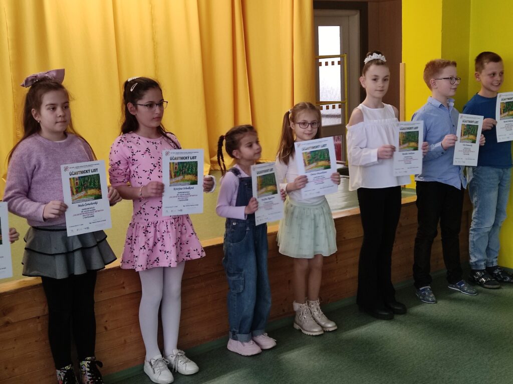 Obvodní kolo, které se konalo v pátek 13. března 2026, bylo velmi náročné, zvláště časově. V každé kategorii soutěžilo 18 – 22 žáků. Nejpočetnější byla I. kategorie, ve které soutěžili Martínek Židlík a Terezka Macečková z 2.A. Oba recitovali výborně, dlouho museli čekat na vyhodnocení. Terezka byla nakonec úspěšnější a postoupila do okresního kola z 2. místa. Ve II. kategorii nás zastupovaly Veronika Křupalová a Karla Jakubová, obě ze 4.A. Recitovaly moc pěkně, ale musíme uznat, že tato kategorie byla nejvyrovnanější a některé výkony byly velmi podařené. Holky bohužel dále nepostoupily. Přednes Martina Šabatky ve III. kategorii byl milý, veselý, ale porota bohužel rozhodla, že do dalšího kola postoupí recitátoři s vážnějšími texty.