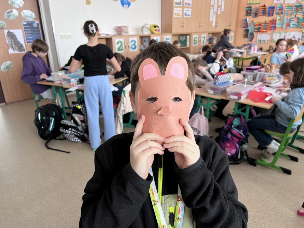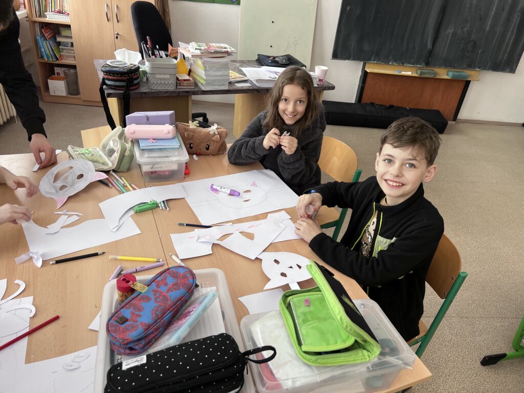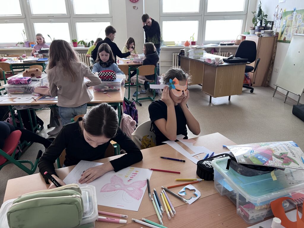 V 5. A se vyráběl karnevalový obličej. Děti pracovaly s papírovým kulatým táckem, nafukovacím balonkem, fixy, pastelkami a lepidlem. Každý vznikající obličej byl originál – někde převládal humor, jinde nápaditost, pečlivost nebo odvážné barvy. Bylo vidět, že když dostanou prostor a materiál, dokážou své představy proměnit ve velmi povedené výrobky.