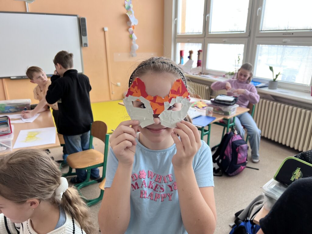 Ve 4. A pak vznikaly masopustní masky – buď podle šablony, nebo podle vlastní fantazie. Děti masky vystřihovaly, omalovávaly, vytvořily otvory na oči a ústa a hlavně přemýšlely i nad tím, aby se daly na obličej skutečně připevnit. Kdo chtěl, mohl masku ještě dotvořit polepením barevnými papíry, a výsledky byly pestré a nápadité.